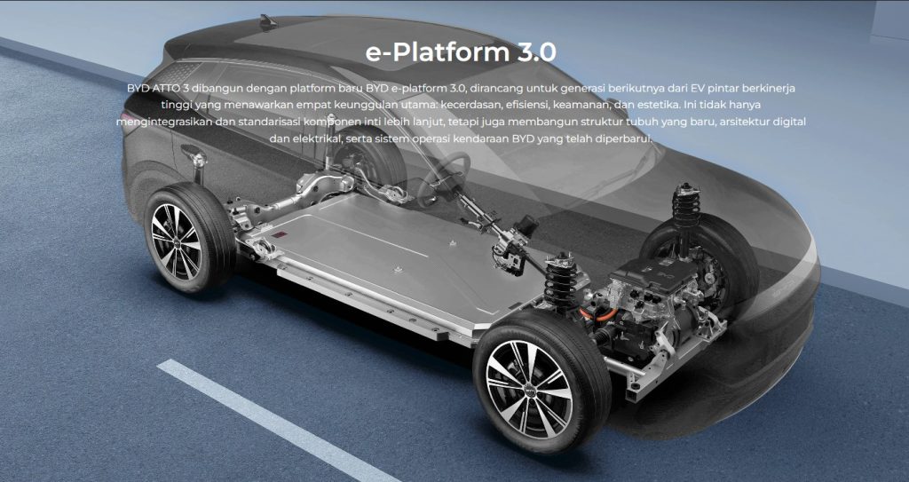 BYD ATTO 3 dibangun di atas e-Platform 3.0, platform khusus kendaraan listrik generasi terbaru dari BYD.