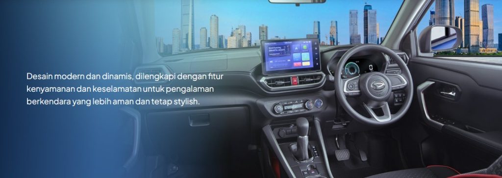 Interior Rocky membawa garis desain horizontal yang membuat kabin terasa lebih lega. Konsol tengah didesain rapi, tombol-tombol mudah dijangkau, dan tata letaknya ergonomis.