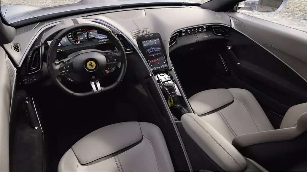 Masuk ke dalam kabin Ferrari Roma, suasana modern dan futuristik langsung terasa. Interior mengusung konsep dual-cockpit, memisahkan area pengemudi dan penumpang dengan desain yang elegan.