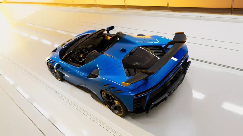 Bagian depan dirancang untuk menghasilkan downforce tinggi, sementara sisi bodi dan diffuser belakang dioptimalkan untuk stabilitas ekstrem. Atap terbuka memberikan dimensi visual yang dramatis sekaligus meningkatkan sensasi emosional saat berkendara.