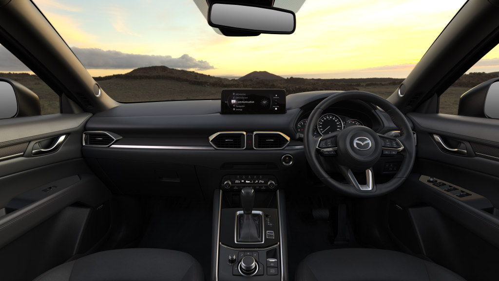 Masuk ke dalam kabin, Mazda CX-5 menawarkan interior yang dirancang dengan fokus pada kenyamanan pengemudi dan penumpang. Tata letak dashboard terlihat bersih dan ergonomis, memudahkan pengoperasian berbagai fitur saat berkendara.