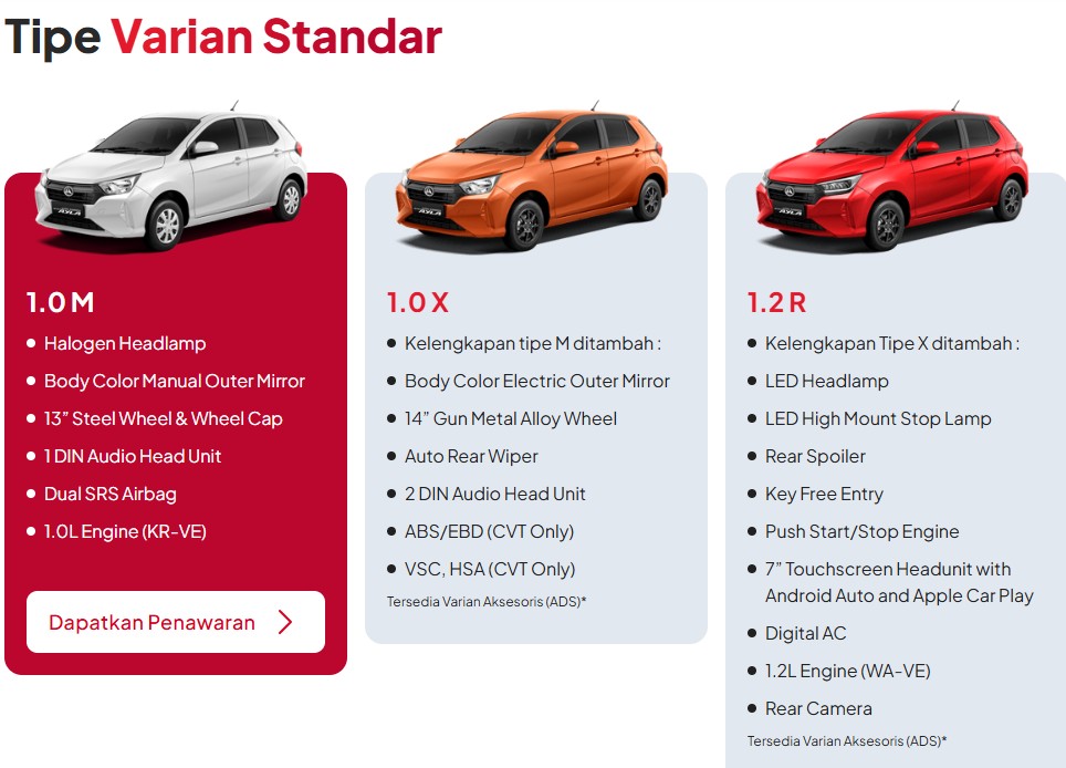Terdapat beberapa varian mesin, transmisi, dan paket aksesoris/ADS yang bisa memilih sesuai biaya dan kebutuhan.