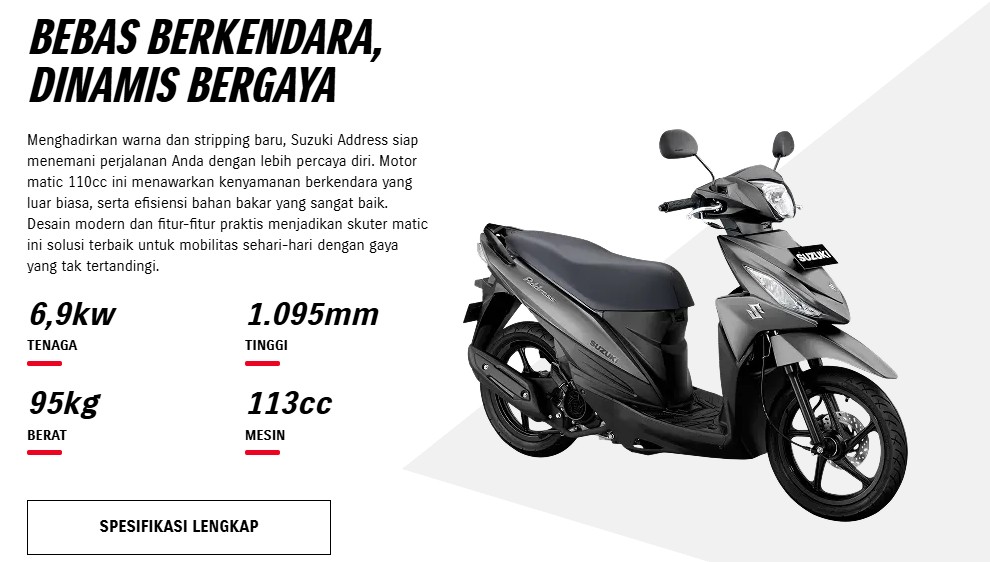 Di kelas motor matic 110cc, Suzuki Address menjadi salah satu pilihan menarik bagi pengguna yang mengutamakan efisiensi dan kenyamanan. Versi FI (Fuel Injection) menawarkan performa lebih stabil dengan konsumsi bahan bakar yang lebih hemat.