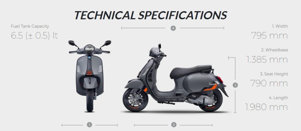 Vespa GTS Super Sport memiliki dimensi lebih besar dibanding seri Sprint atau Primavera. Hal ini memberikan kesan kokoh dan maskulin.